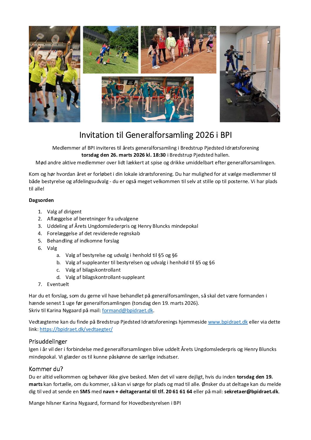 Invitation til Generalforsamling 2023Medlemmer af BPI inviteres til årets Generalforsamling i Bredstrup Pjedsted Idrætsforening torsdag den 23. marts 2023 kl. 18:30 i Bredstrup Pjedsted hallen. Mød andre aktive medlemmer over lidt lækkert at spise og drikke...